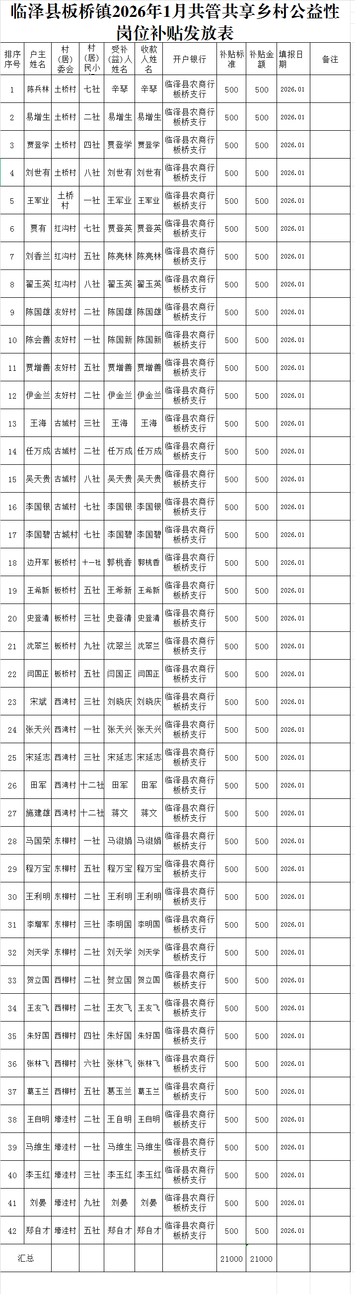 临泽县板桥镇2026年1月共管共享乡村公益性岗位补贴发放表