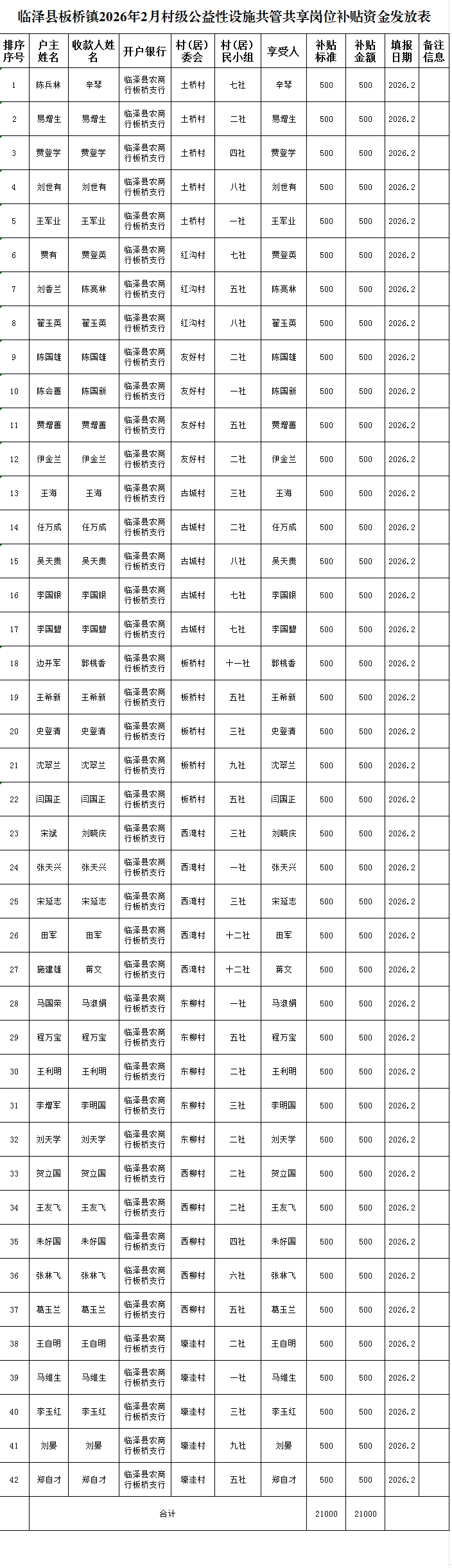 临泽县板桥镇2026年2月村级公益性设施共管共享岗位补贴资金发放表