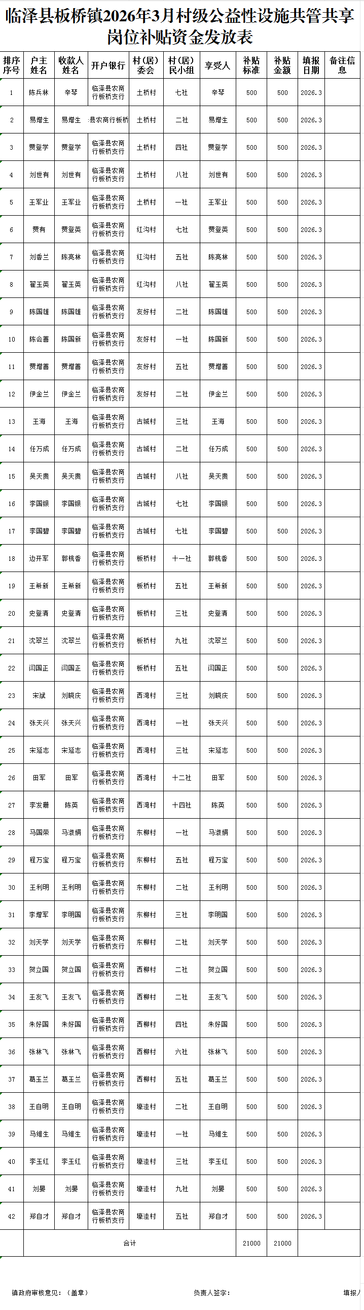 临泽县板桥镇2026年3月村级公益性设施共管共享岗位补贴资金发放表