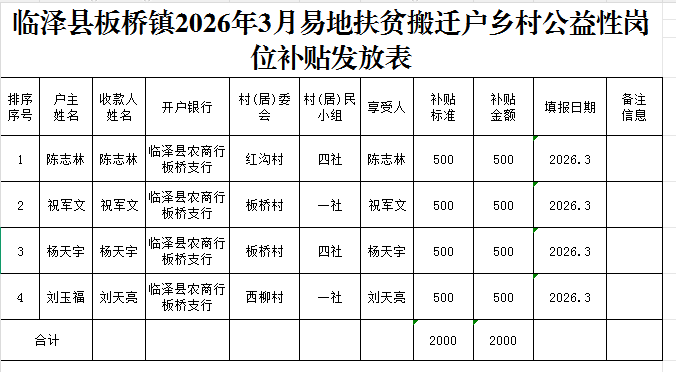 临泽县板桥镇2026年3月易地扶贫搬迁户乡村公益性岗位补贴发放表
