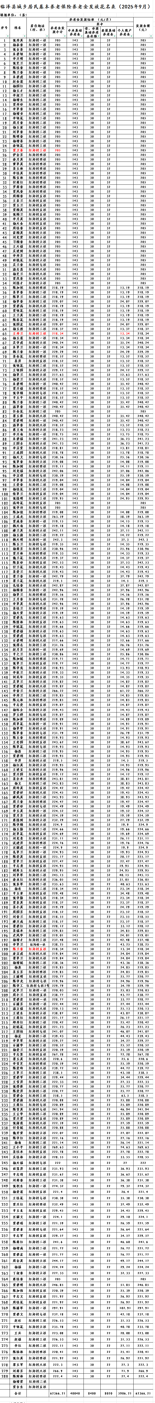 临泽县板桥镇红沟村城乡居民基本养老保险养老金发放花名表(2025年9月)