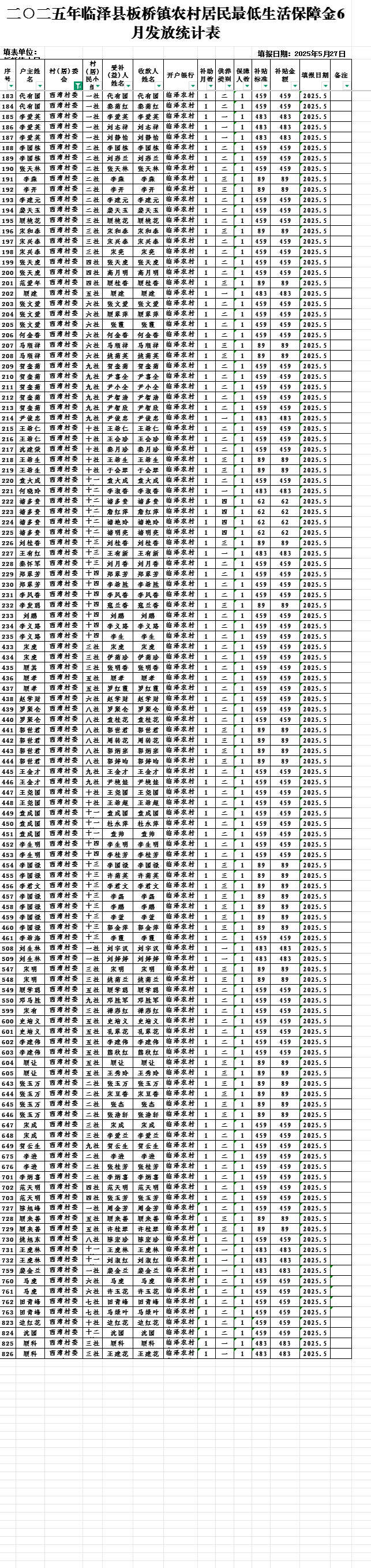 二○二五年临泽县板桥镇西湾村农村居民最低生活保障金6月发放统计表