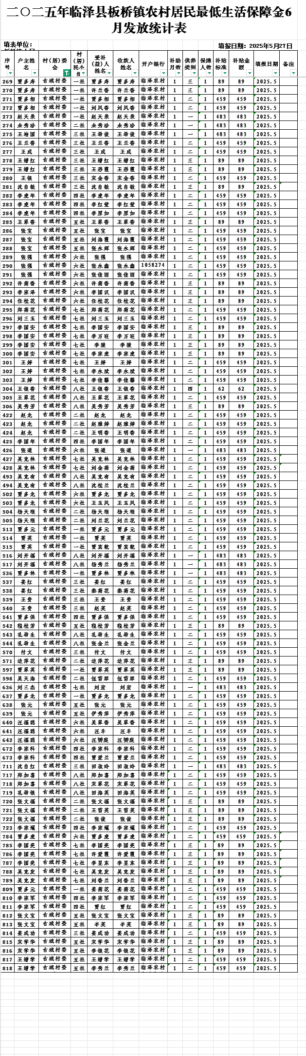二○二五年临泽县板桥镇古城村农村居民最低生活保障金6月发放统计表