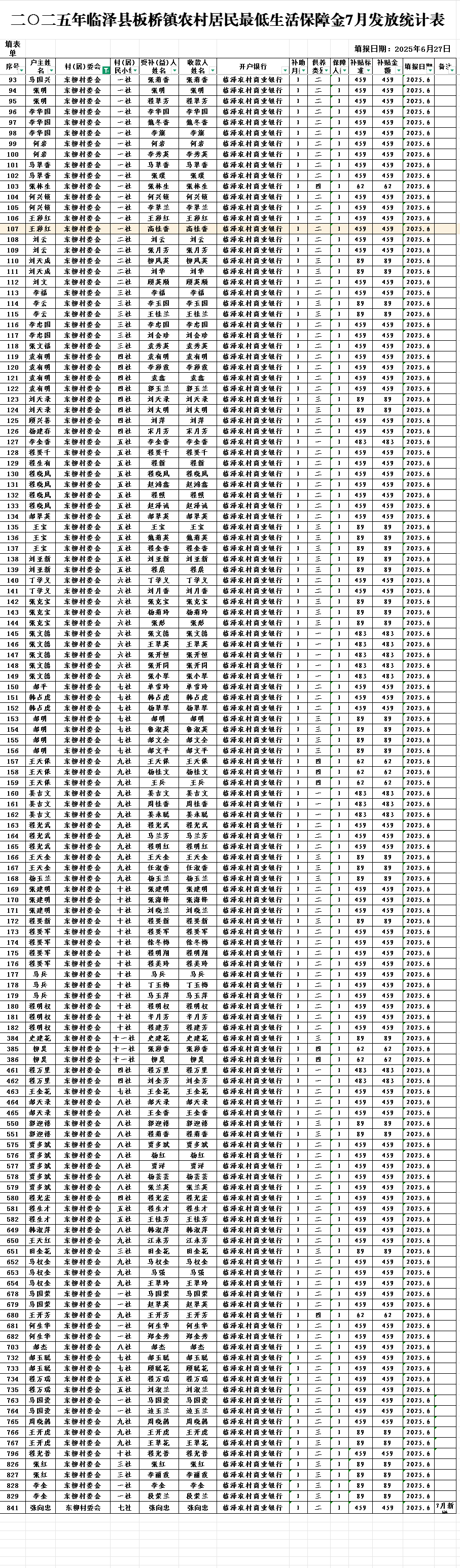 二○二五年临泽县板桥镇东柳村农村居民最低生活保障金7月发放统计表