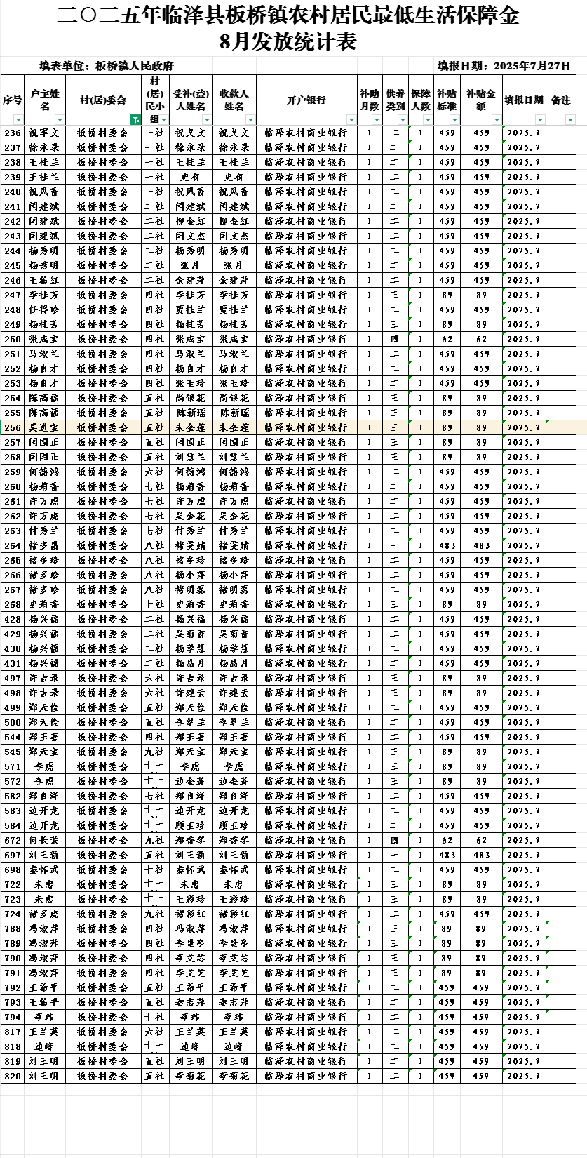 二○二五年临泽县板桥镇板桥村农村居民最低生活保障金 8月发放统计表