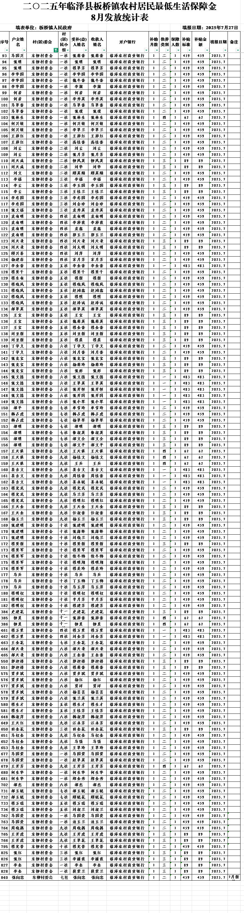 二○二五年临泽县板桥镇东柳村农村居民最低生活保障金 8月发放统计表