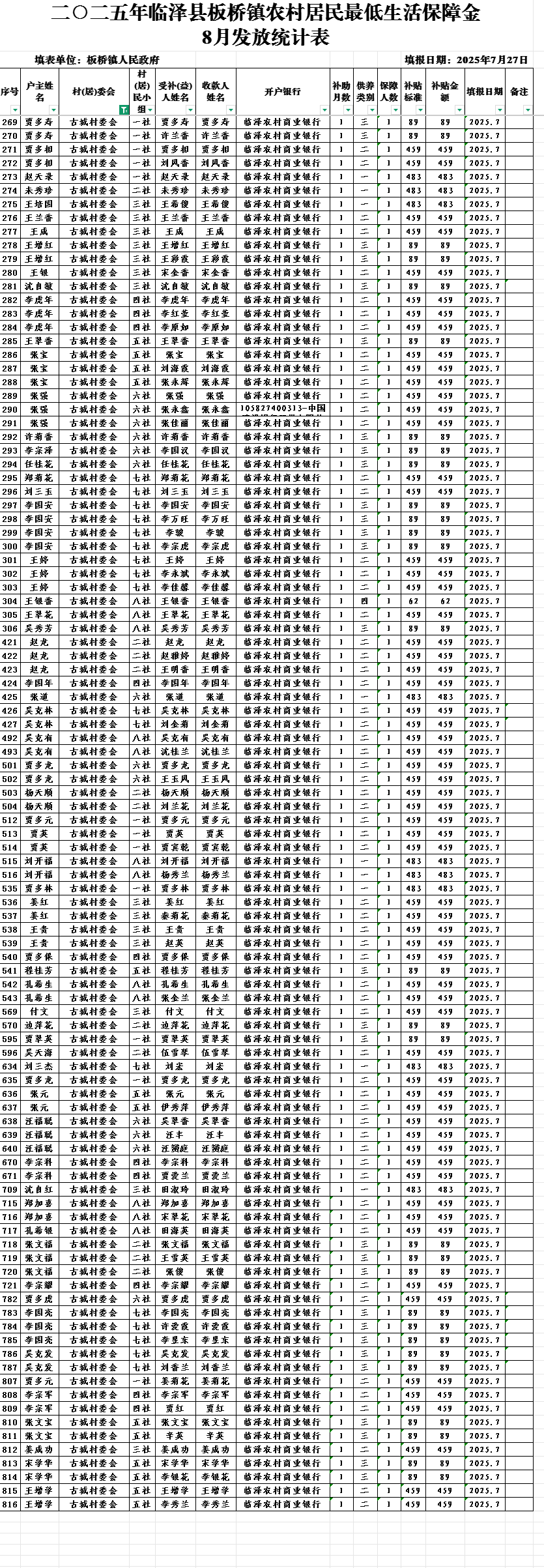 二○二五年临泽县板桥镇古城村农村居民最低生活保障金 8月发放统计表