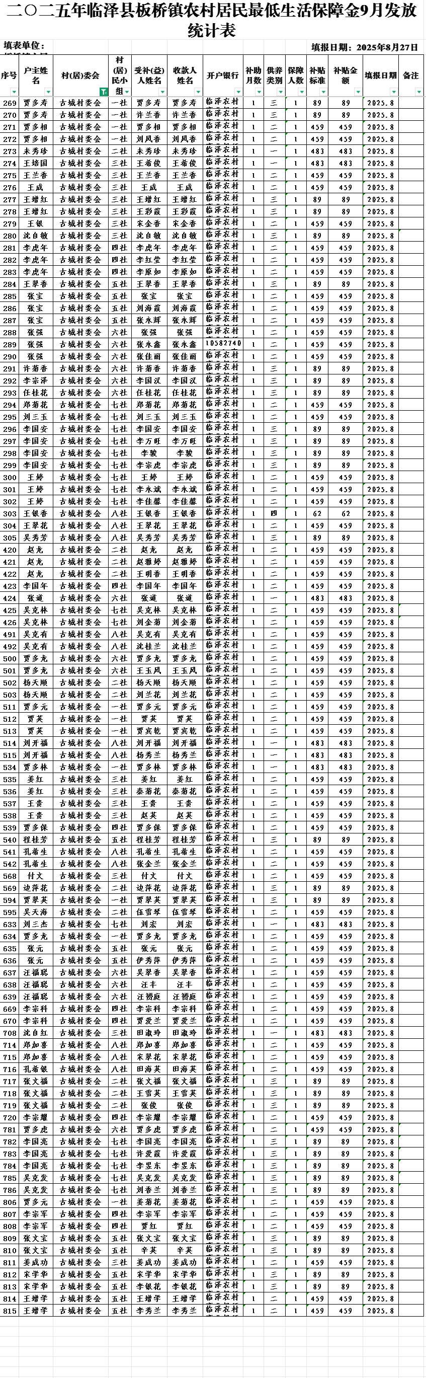 二○二五年临泽县板桥镇古城村农村居民最低生活保障金 9月发放统计表