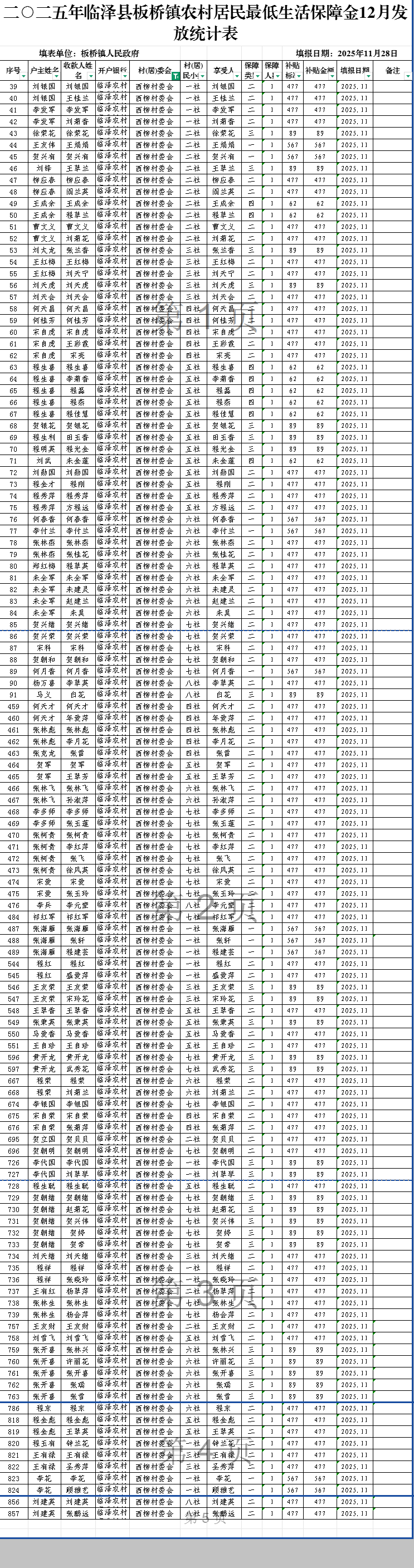 二○二五年临泽县板桥镇西柳村农村居民最低生活保障金12月发放统计表