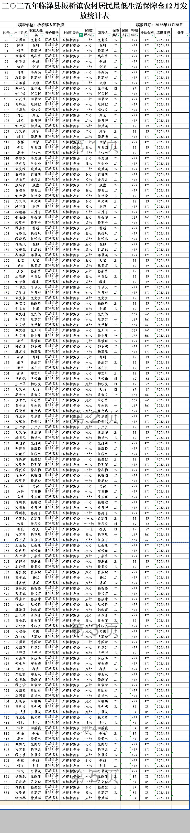 二○二五年临泽县板桥镇东柳村农村居民最低生活保障金12月发放统计表