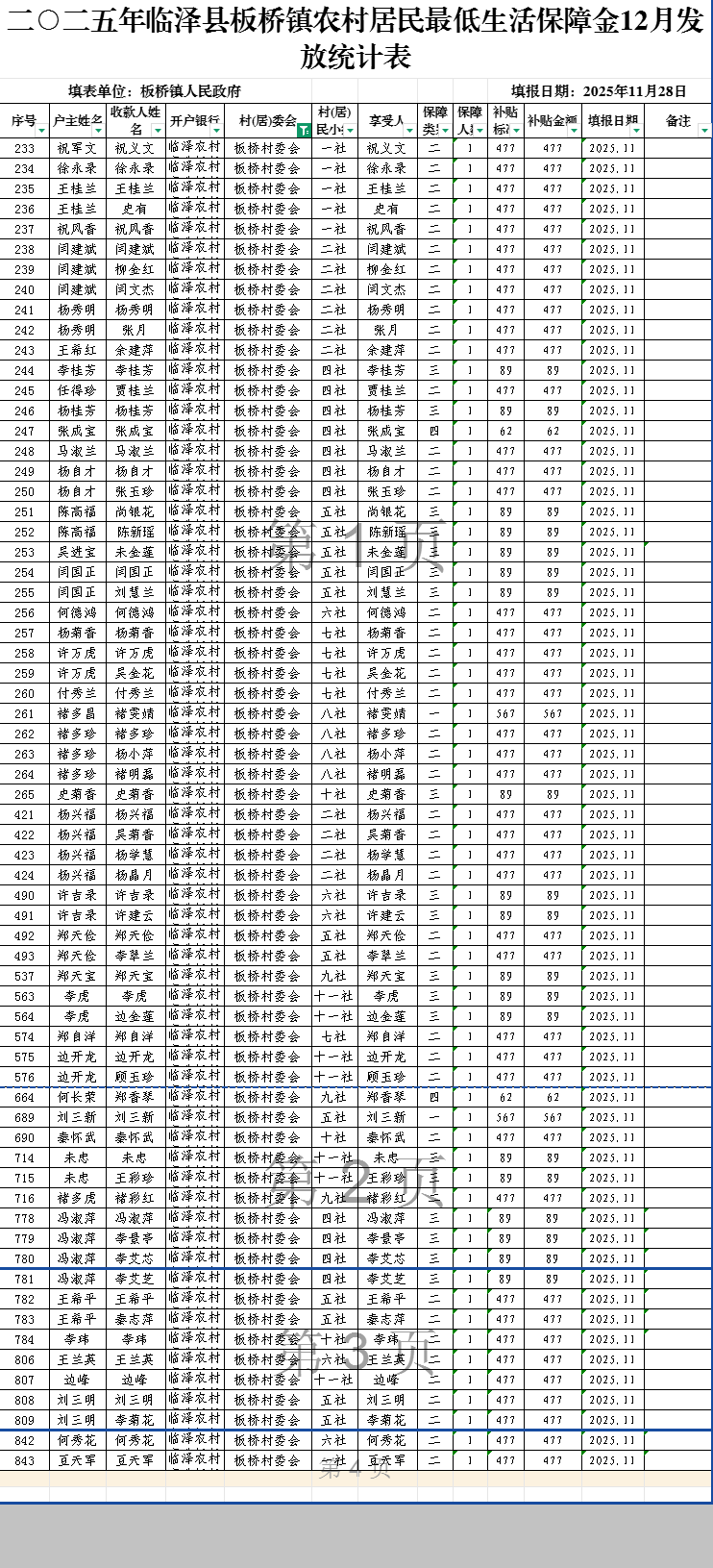 二○二五年临泽县板桥镇板桥村农村居民最低生活保障金12月发放统计表