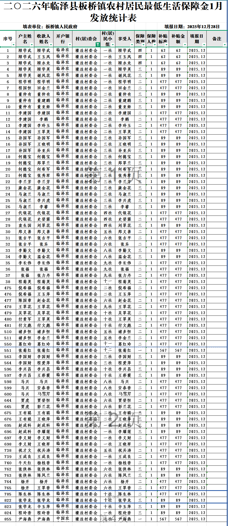 二○二六年临泽县板桥镇壕洼村农村居民最低生活保障金1月发放统计表