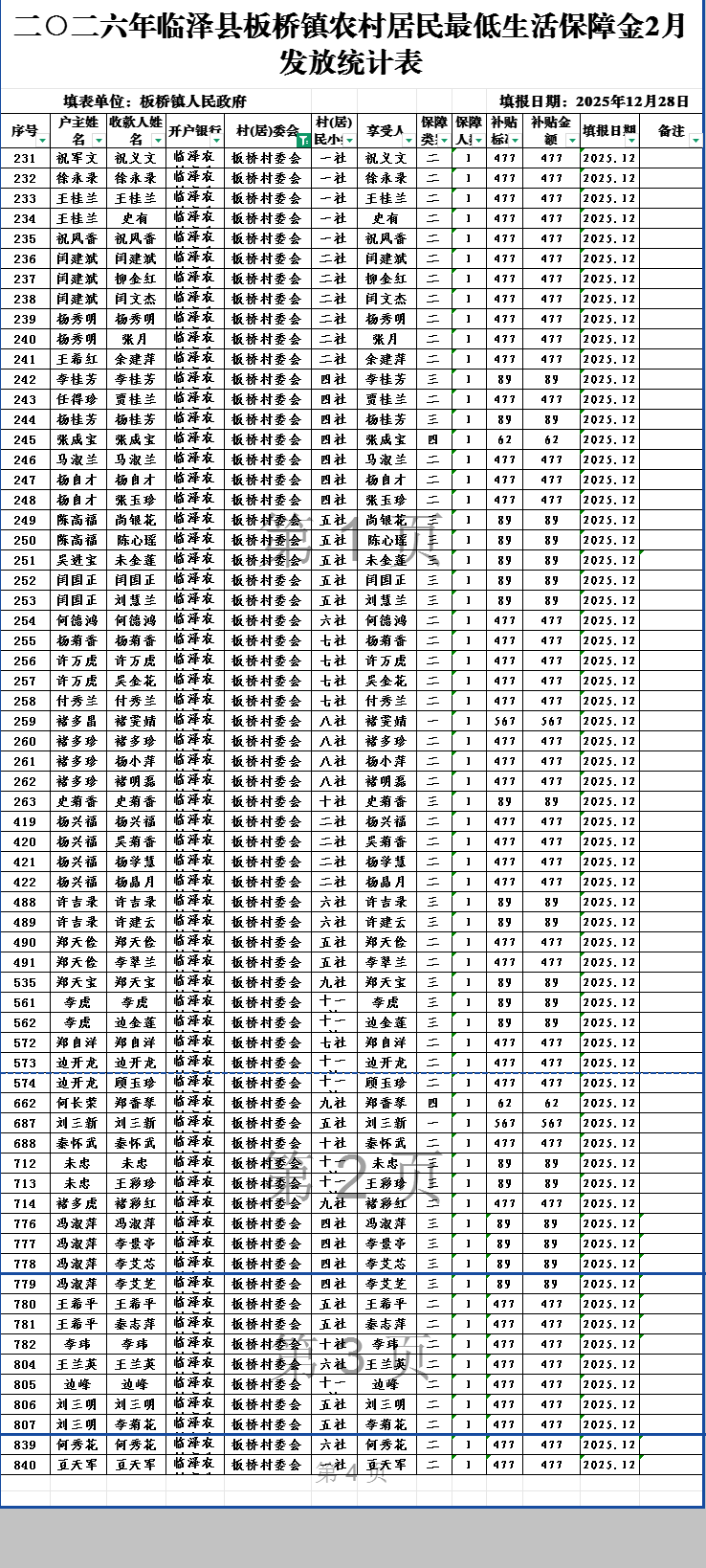 二○二六年临泽县板桥镇板桥村农村居民最低生活保障金2月发放统计表