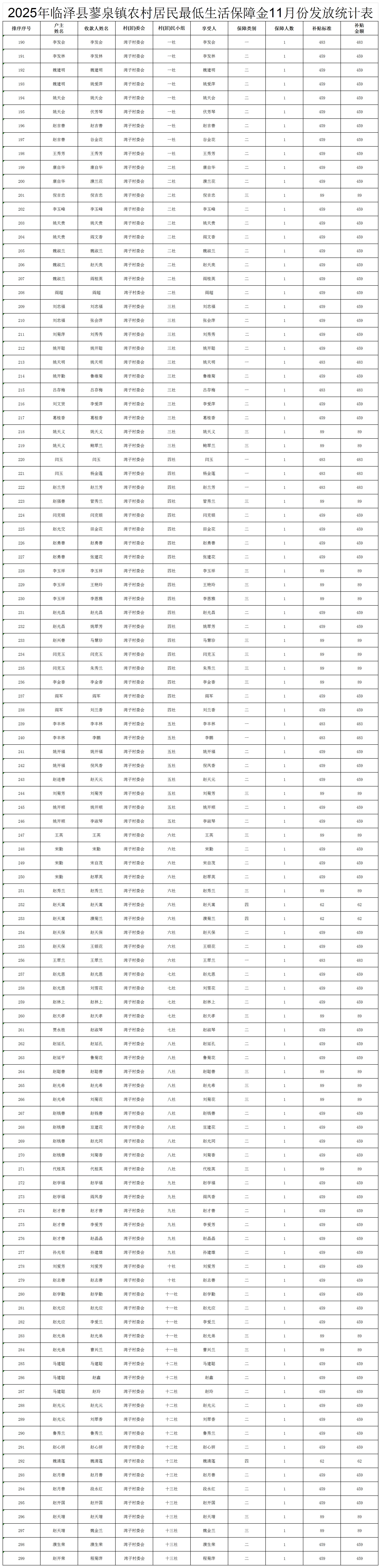 2025年临泽县蓼泉镇农村居民最低生活保障金11月份发放统计表(湾子村)