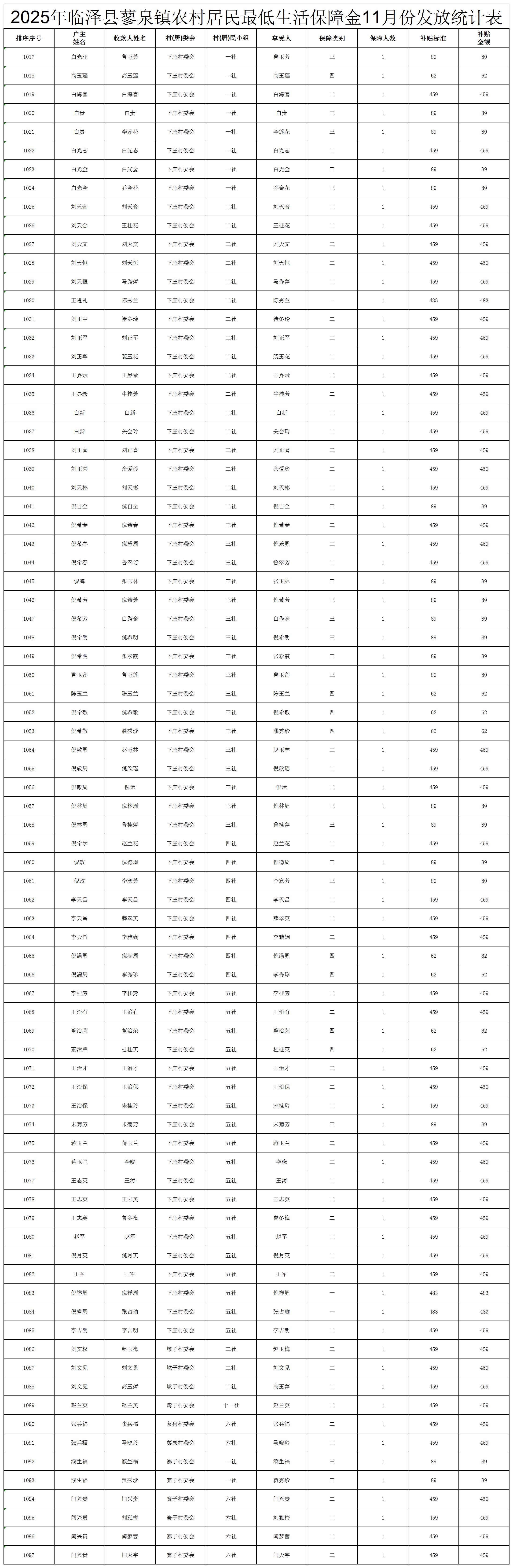 2025年临泽县蓼泉镇农村居民最低生活保障金11月份发放统计表(下庄村)