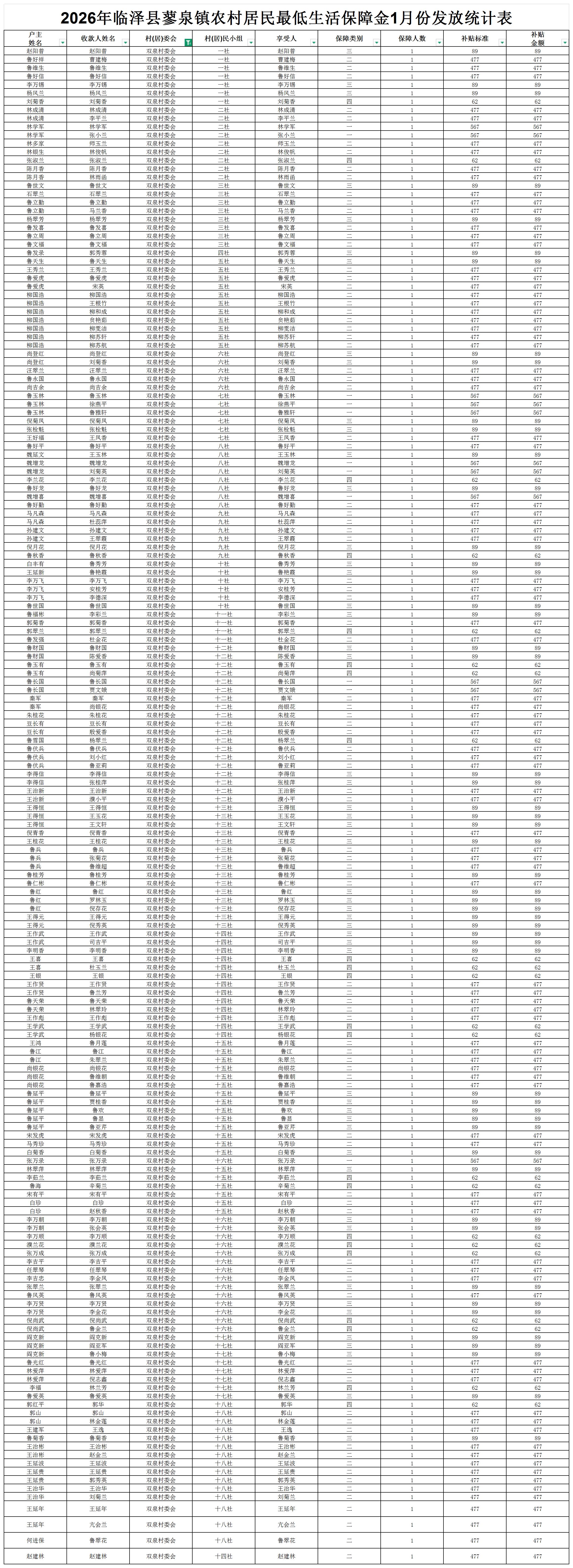 2026年临泽县蓼泉镇农村居民最低生活保障金1月份发放统计表(双泉村)
