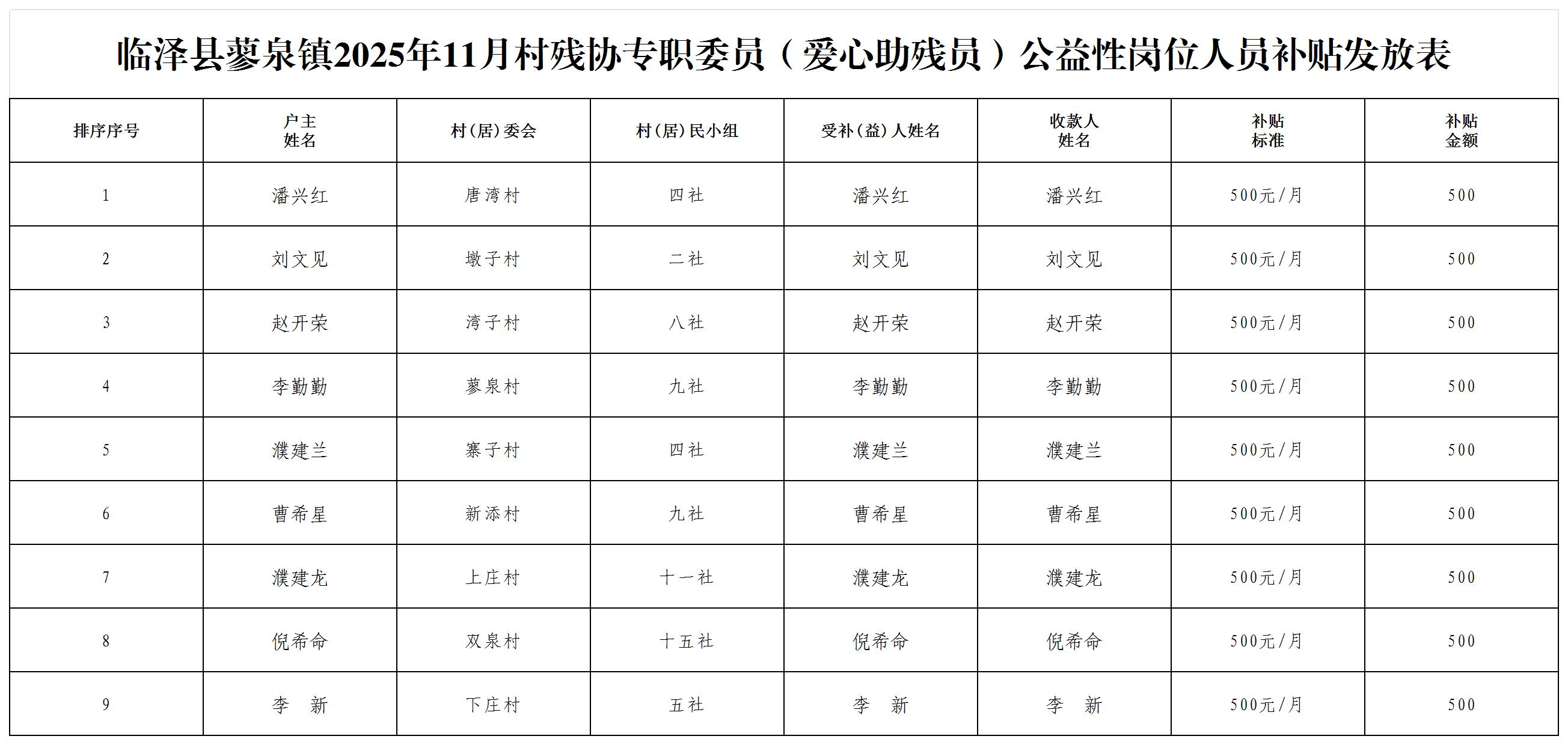 临泽县蓼泉镇2025年11月村残协专职委员(爱心助残员)公益性岗位人员补贴发放表