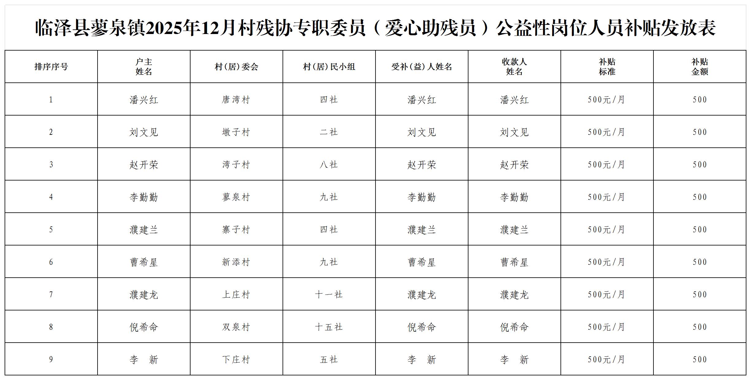 临泽县蓼泉镇2025年12月村残协专职委员(爱心助残员)公益性岗位人员补贴发放表