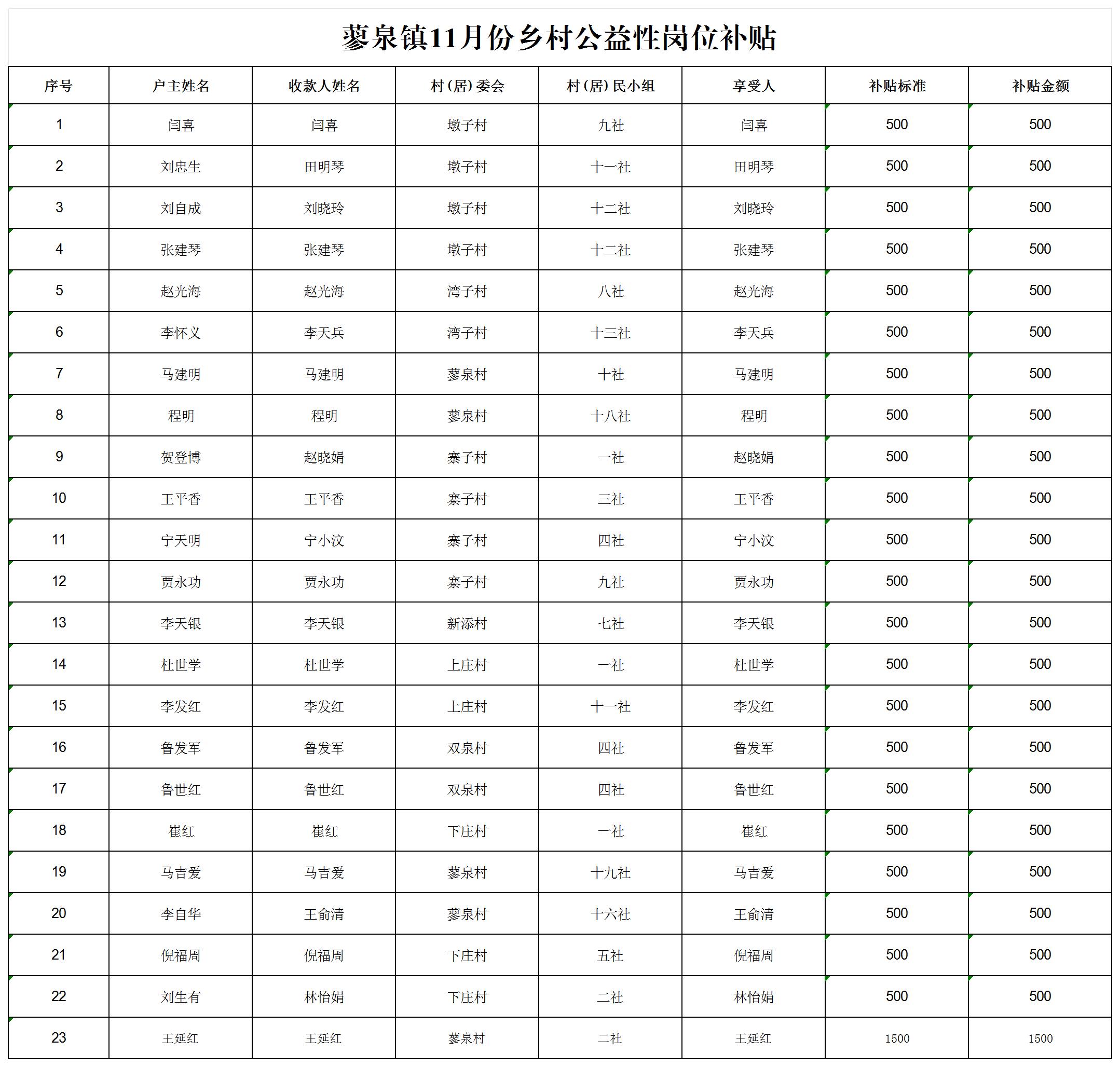 蓼泉镇11月共管共享乡村公益性岗位补贴