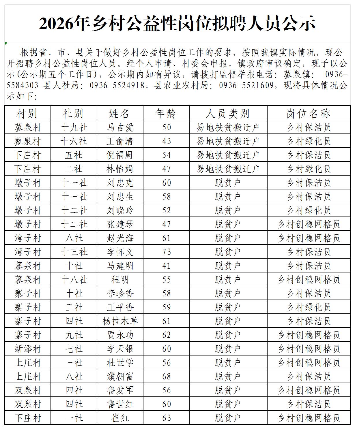 2026年乡村公益性岗位拟聘人员公示