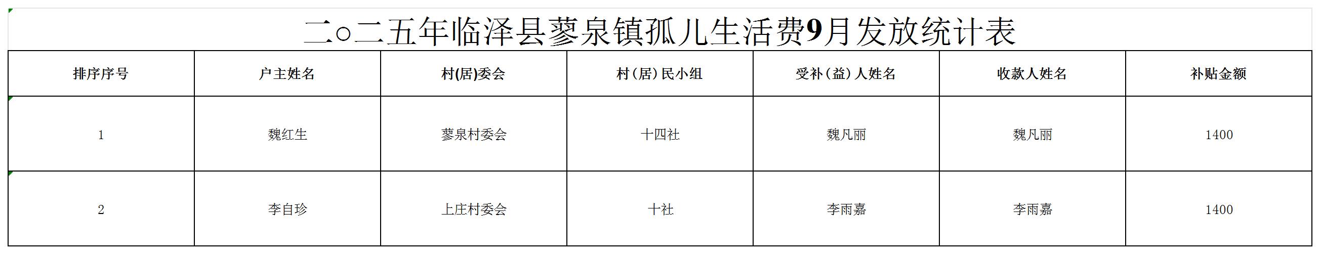 二○二五年临泽县蓼泉镇孤儿生活费9月发放统计表