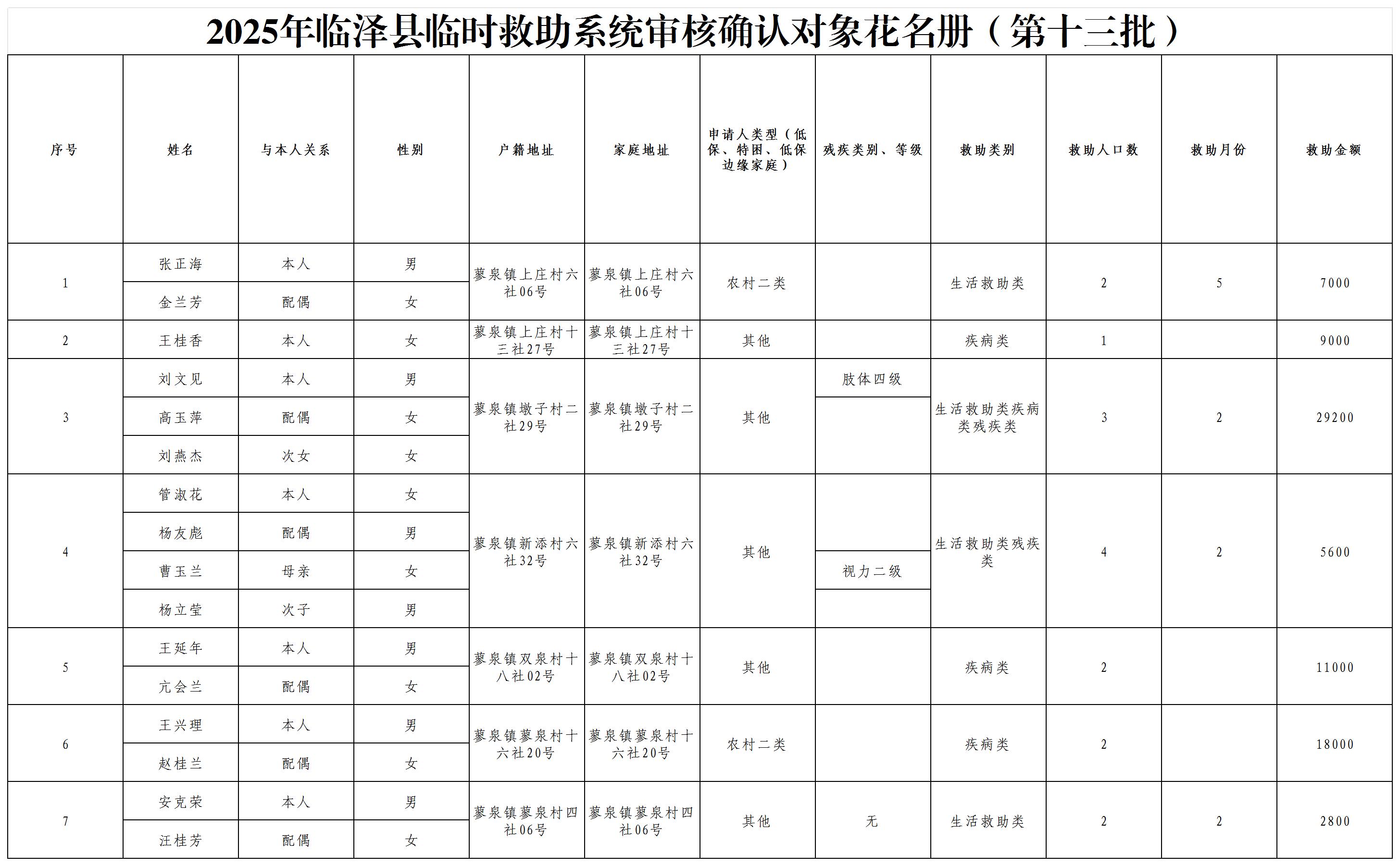 2025年临泽县临时救助系统审核确认对象花名册(第十三批)