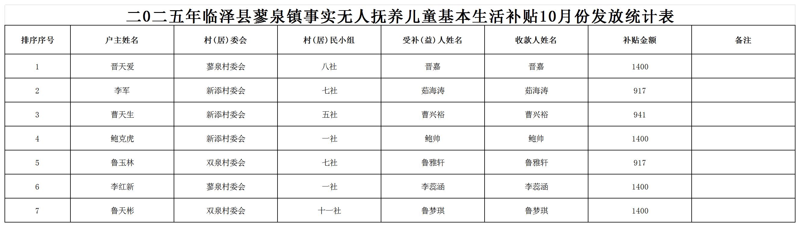 二0二五年临泽县蓼泉镇事实无人抚养儿童基本生活补贴10月份发放统计表