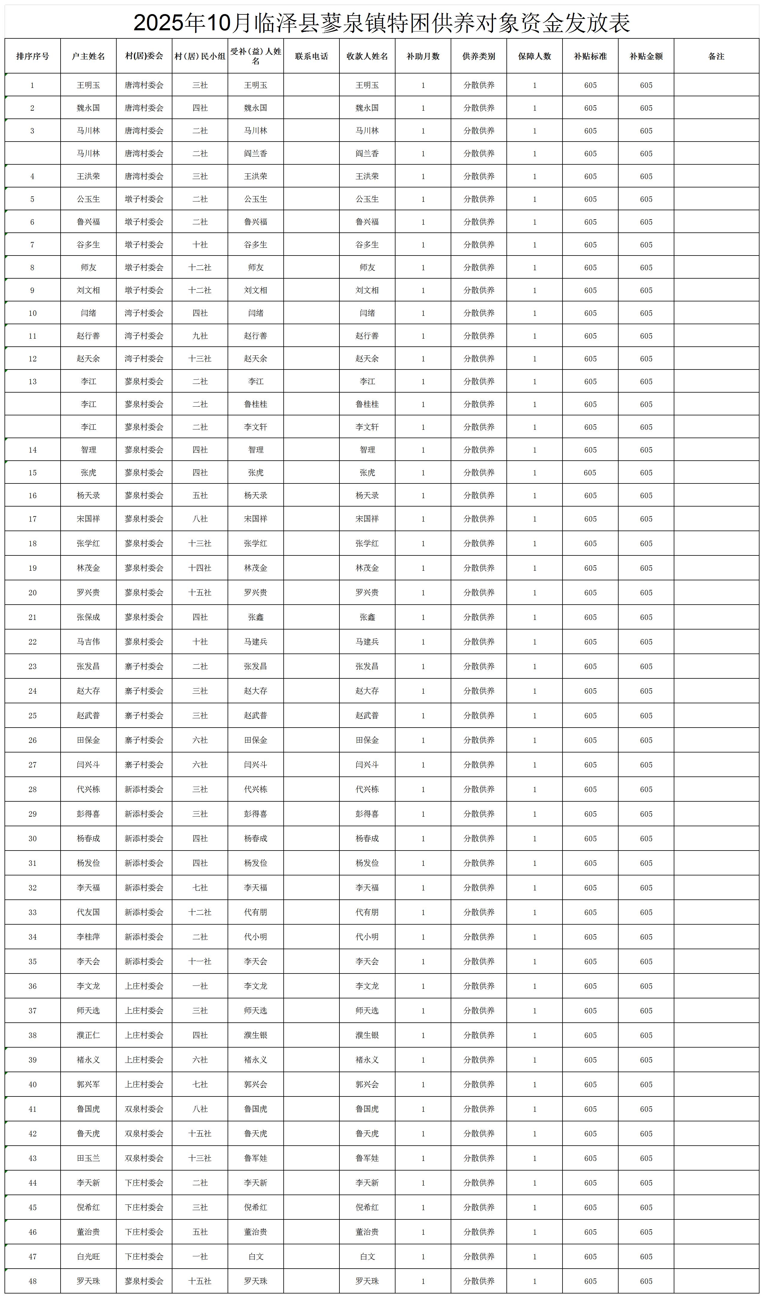 2025年10月临泽县蓼泉镇特困供养对象资金发放表