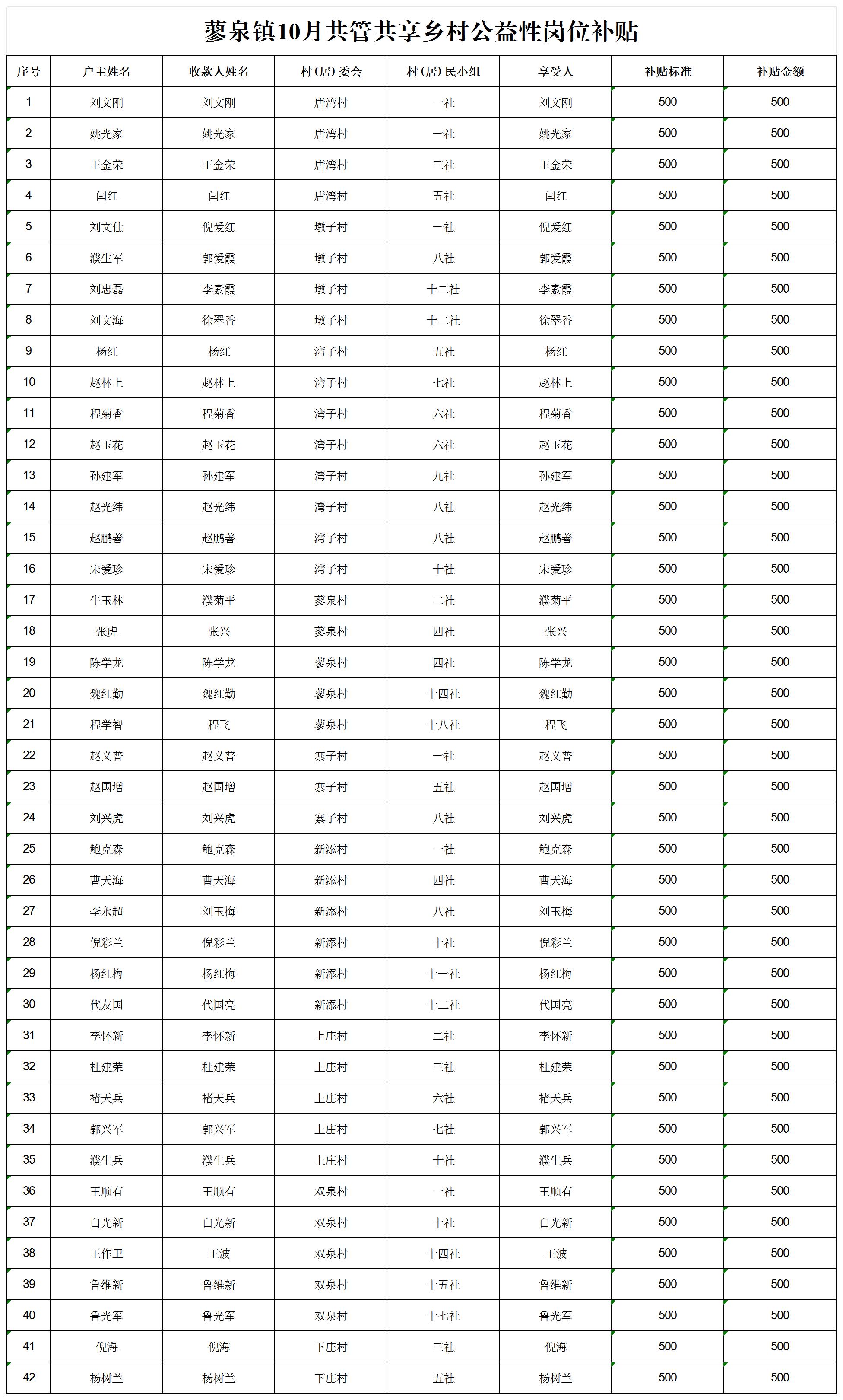 蓼泉镇10月共管共享乡村公益性岗位补贴