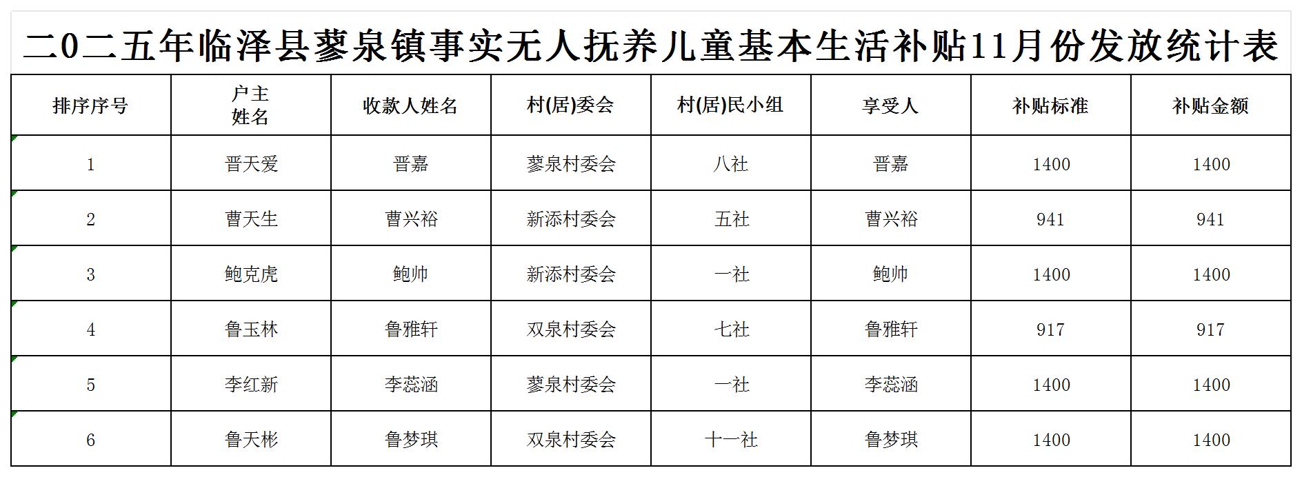 二0二五年临泽县蓼泉镇事实无人抚养儿童基本生活补贴11月份发放统计表