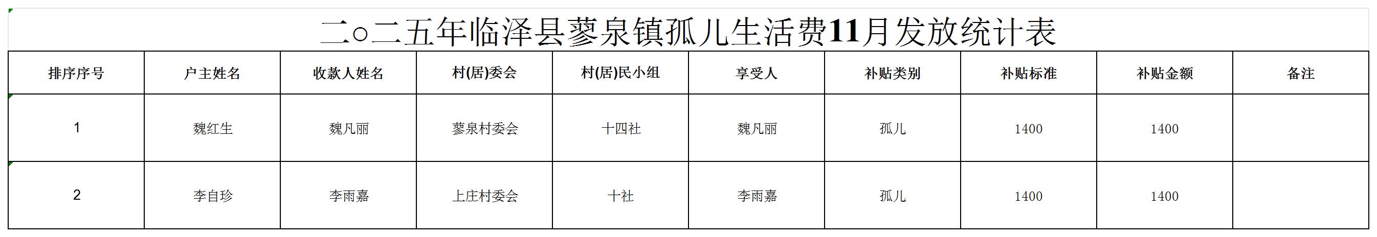 二○二五年临泽县蓼泉镇孤儿生活费11月发放统计表