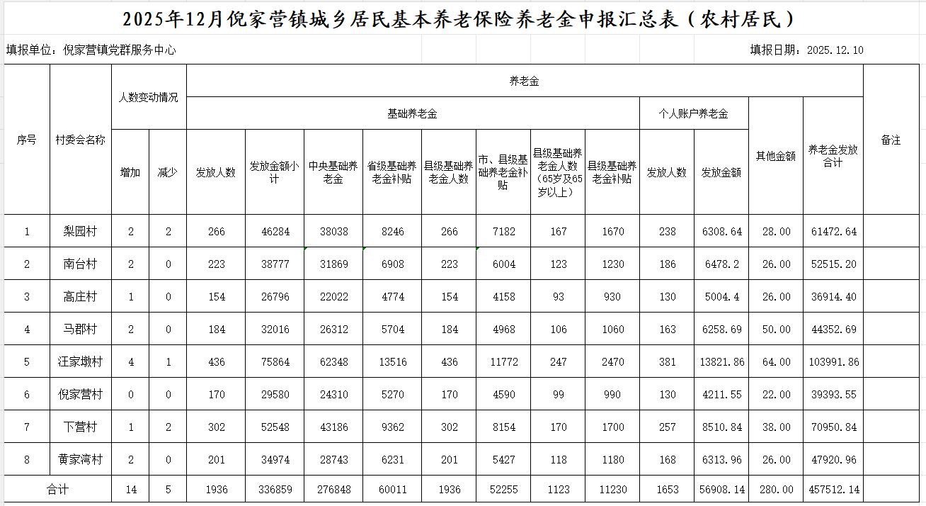 2025年12月倪家营镇城乡居民基本养老保险养老金申报汇总表(农村居民)