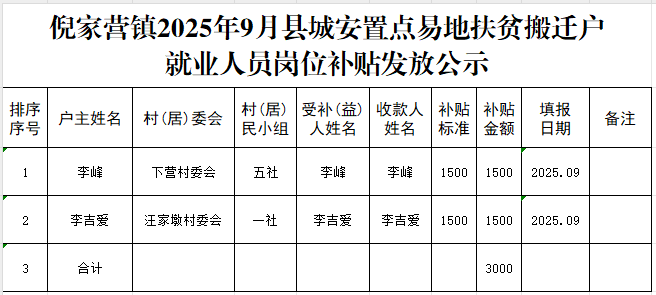 倪家营镇2025年9月县城安置点易地扶贫搬迁户就业人员岗位补贴发放公示