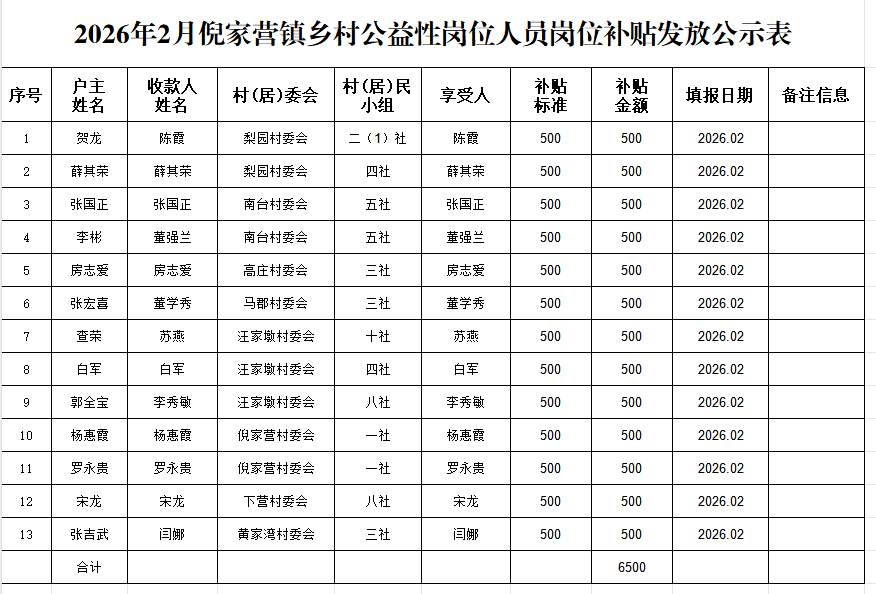 2026年2月倪家营镇乡村公益性岗位人员岗位补贴发放公示
