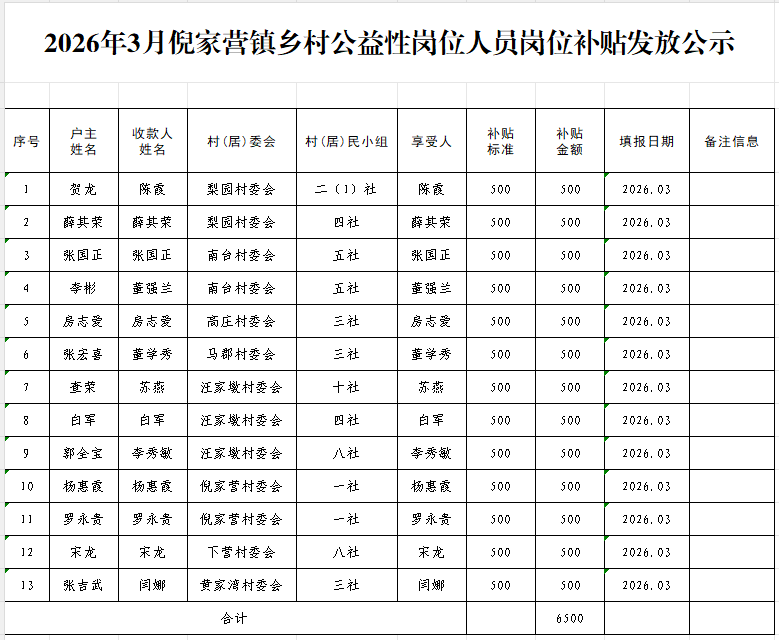 2026年3月倪家营镇乡村公益性岗位人员岗位补贴发放公示