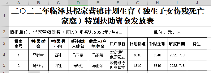 现将2022年倪家营镇马郡村计划生育(独生子女伤残死亡家庭)特别扶助资金发放公示如下: