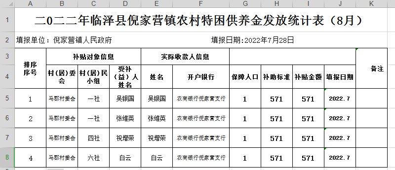2022年临泽县倪家营镇马郡村农村特困供养金发放公示