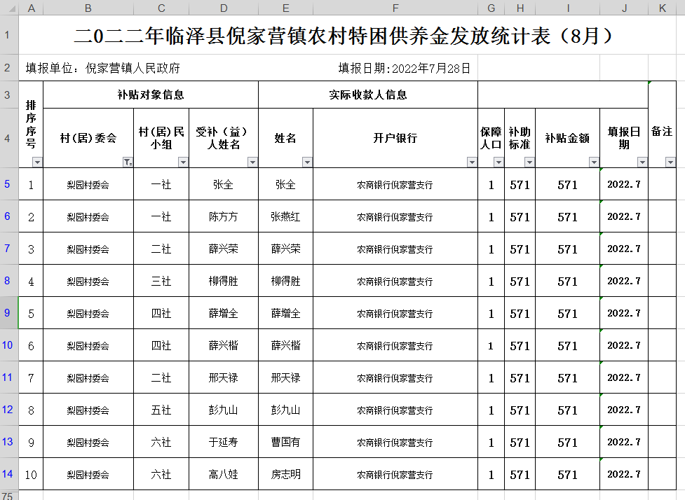现将2022年临泽县倪家营镇梨园村农村特困供养金发放如下: