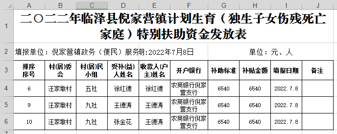 2022年临泽县倪家营镇汪家墩村计划生育(独生子女伤残死亡家庭)特别扶助资金发放公示