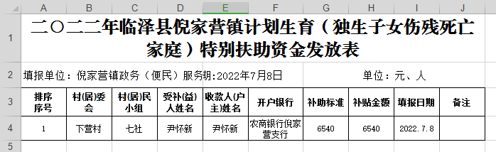 现将2022年临泽县倪家营镇下营村计划生育(独生子女伤残死亡家庭)特别扶助资金发放公示如下: