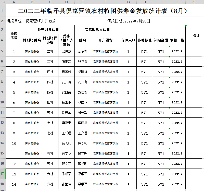 现将2022年临泽县倪家营镇南台村农村特困供养金发放公示如下:
