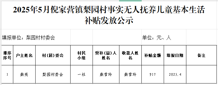 2025年5月倪家营镇梨园村事实无人抚养儿童基本生活补贴发放公示
