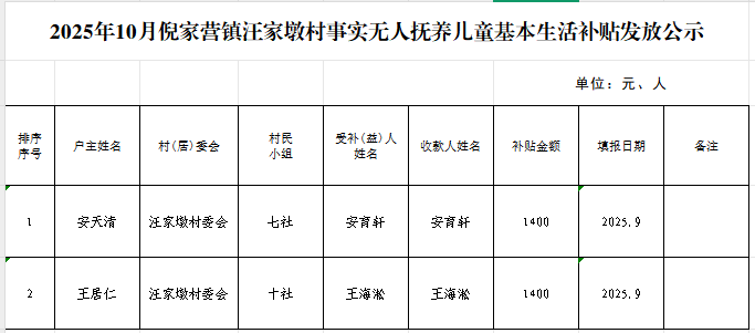 2025年10月倪家营镇汪家墩村事实无人抚养儿童基本生活补贴发放公示