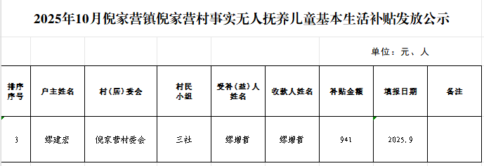 2025年10月倪家营镇倪家营村事实无人抚养儿童基本生活补贴发放公示