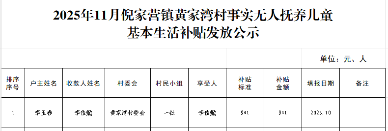 2025年11月倪家营镇黄家湾村事实无人抚养儿童基本生活补贴发放公示
