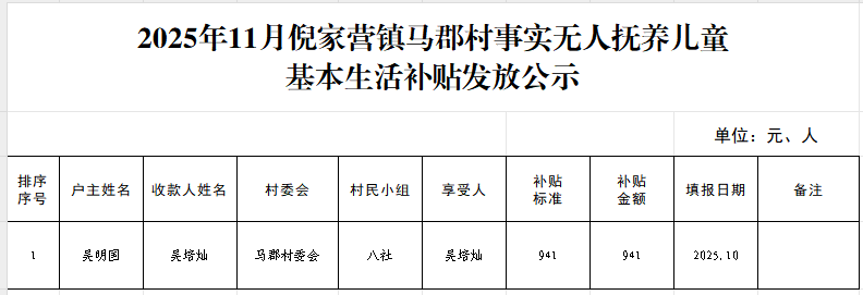 2025年11月倪家营镇马郡村事实无人抚养儿童基本生活补贴发放公示