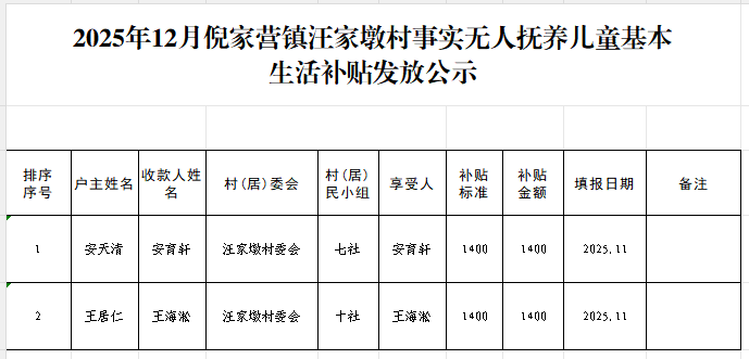 2025年12月倪家营镇汪家墩村事实无人抚养儿童基本生活补贴发放公示