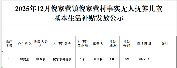 2025年12月倪家营镇倪家营村事实无人抚养儿童基本生活补贴发放公示