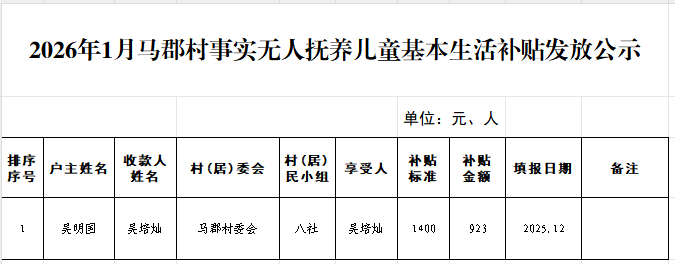 2026年1月马郡村事实无人抚养儿童基本生活补贴发放公示