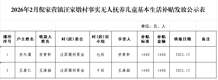 2026年2月倪家营镇汪家墩村事实无人抚养儿童基本生活补贴发放公示